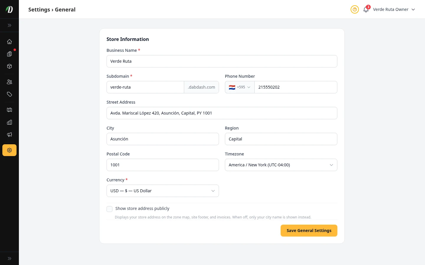 Set your business name, address, phone number, subdomain, and timezone.