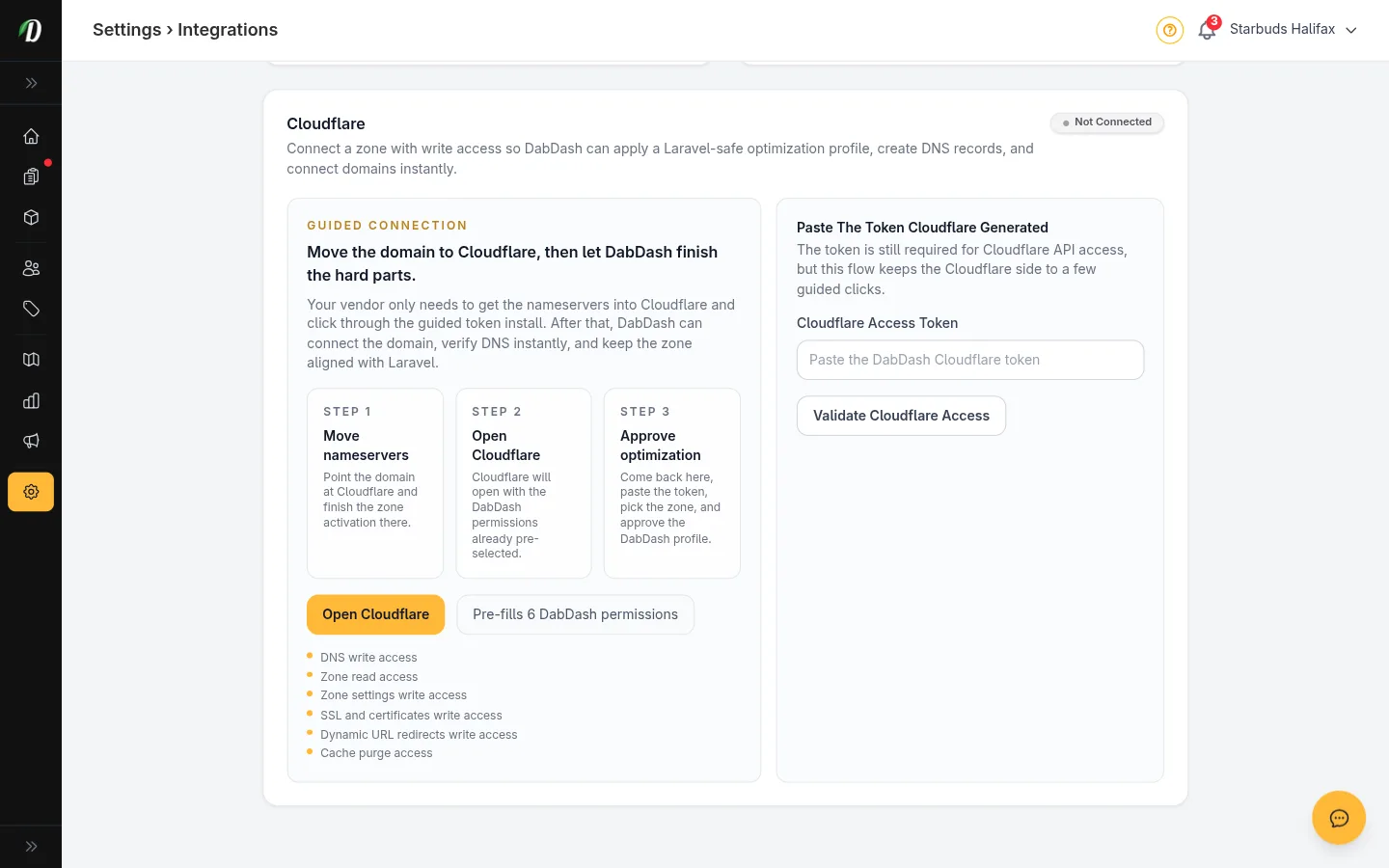 - Only connect Cloudflare zones you want DabDash to manage. The token grants write access to DNS, SSL, and zone settings.
